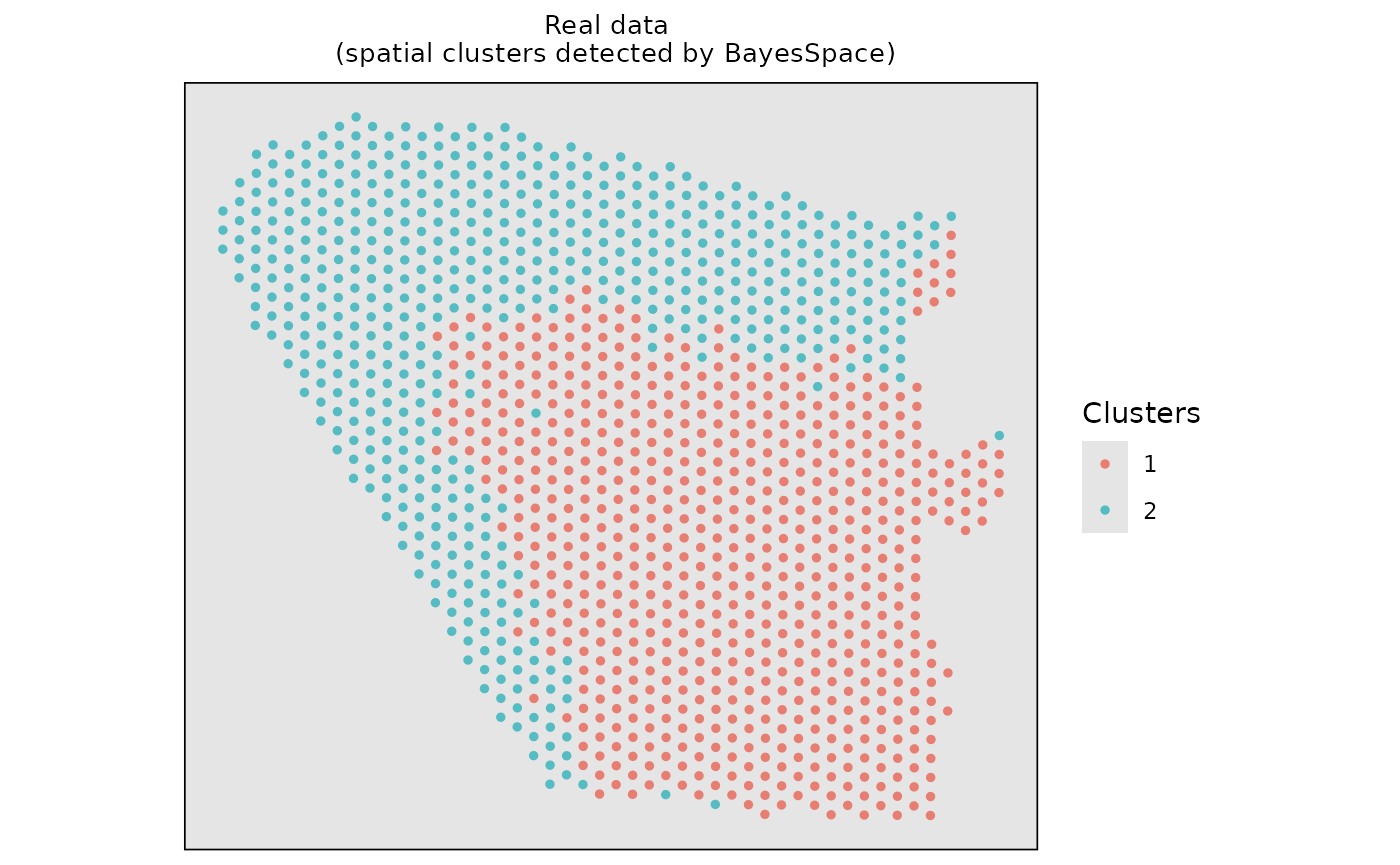 ggplot2::ggtitle("Real data \n (spatial clusters detected by BayesSpace)") +